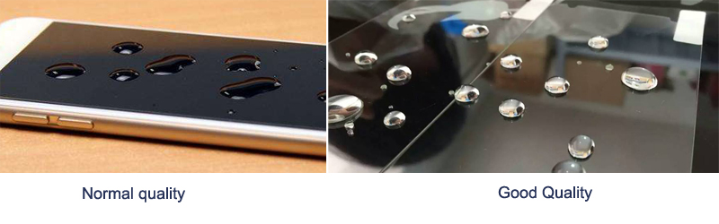 Drop a water on the glass screen guardz, check the shape of the water. If the water is very round, also leave no water mark while leaning your phone, then congratulate, you got a great tempered glass screen protector. Let's check the left one, the drops are not in round shape, touching is not so smooth in the same time.