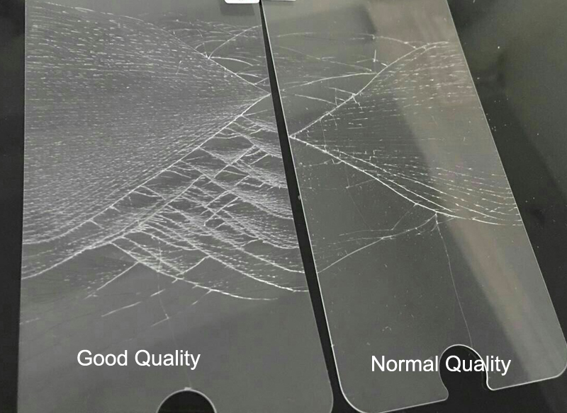 Just bend it, and you’ll find that it’s easily get broken. Don’t worry about it, it happens no matter how good quality the tempered glass is, glass is glass, However, the bad quality tempered glass would break and looks more like pieces by pieces as shown by right picture, while a good quality tempered glass breaks and looks like net, you can find so many lines no it, which means better structure to anti-breaks.